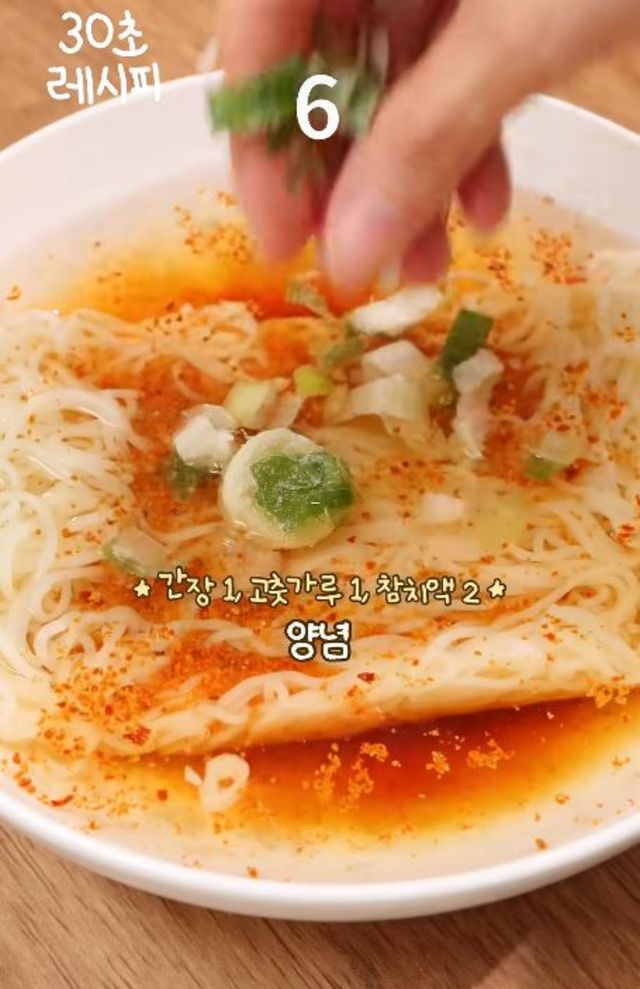 조리의 시작은 일반 마른 소면이 아닌 삶아져 냉동된 소면이다. '지현쿡'은 냉동 소면을 사용해야 국물이 텁텁해 지지 않는다고 덧붙였다. 그릇에 냉동 소면을 담고 뜨거운 물 500ml를 부은 뒤, 간장 한 스푼과 고춧가루 한 스푼, 참치액 두 스푼을 넣어 양념을 완성한다. 이러면 기본 준비는 끝난다.