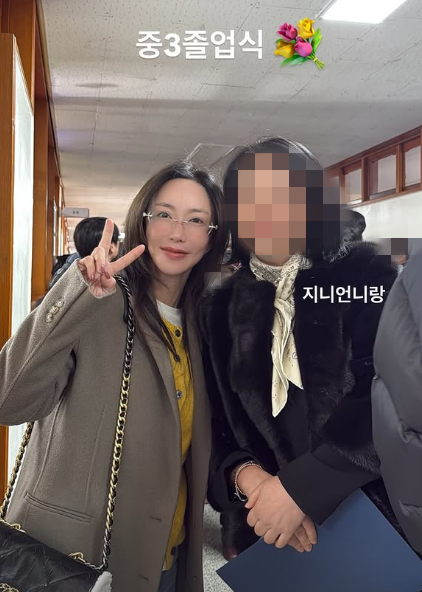 사진 속 슈는 중학교 3학년 아들의 졸업식에 참석해 지인과 나란히 서서 브이 포즈를 취하고 있는 모습으로, 단정한 코트 차림에 안경을 매치한 내추럴한 스타일링이 눈길을 끈다.