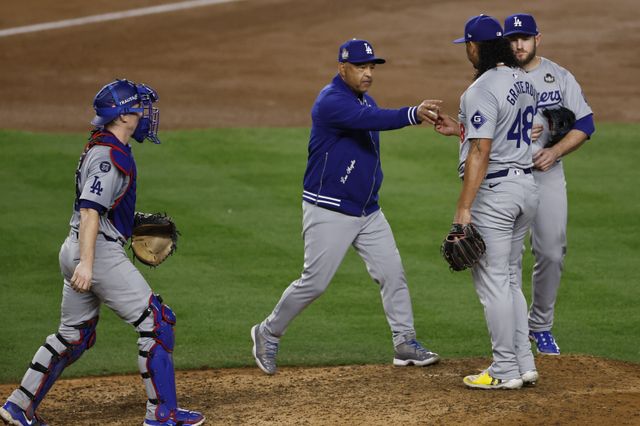 epa11693468 Los Angeles Dodgers pitcher Brusdar Graterol (2-R) is relieved by Los Angeles Dodgers manager Dave Roberts (2-L) during the sixth inning of game five of the Major League Baseball (MLB) World Series between the American League Champion New York Yankees and the National League Champion Los Angeles Dodgers at Yankees Stadium in the Bronx borough of New York, New York, USA, 30 October 2024. The World Series is the best-of-seven games. EPA/CJ GUNTHER/2024-10-31 12:10:03/