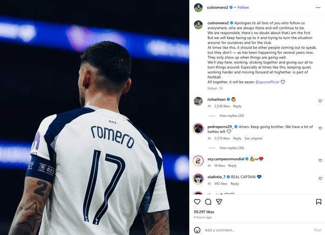 로메로는 글 막바지에 "우리는 이 자리에 남아 상황을 뒤집기 위해 모든 것을 바칠 것이다. 이런 시기일수록 조용히 더 열심히 일하고, 모두가 같은 방향으로 가야 한다. 함께라면 더 쉬워질 것"이라며 팀과 팬을 향한 메시지로 글을 마무리했다.