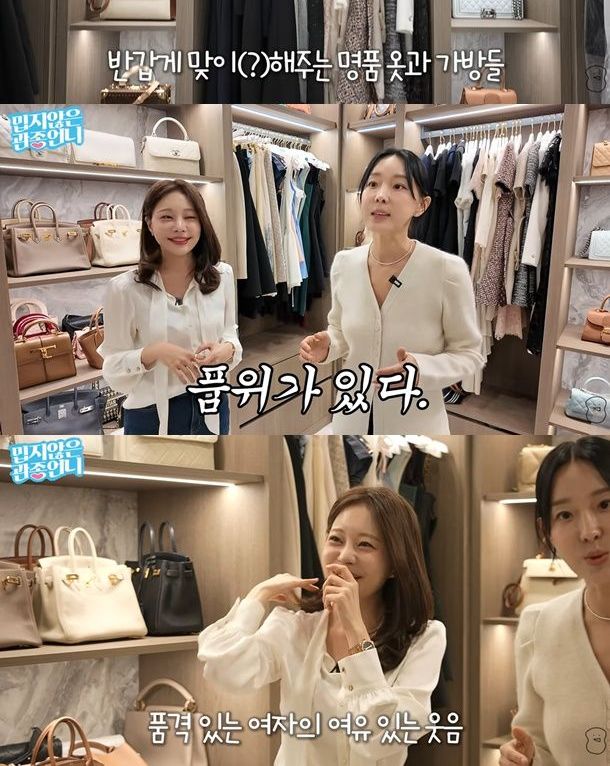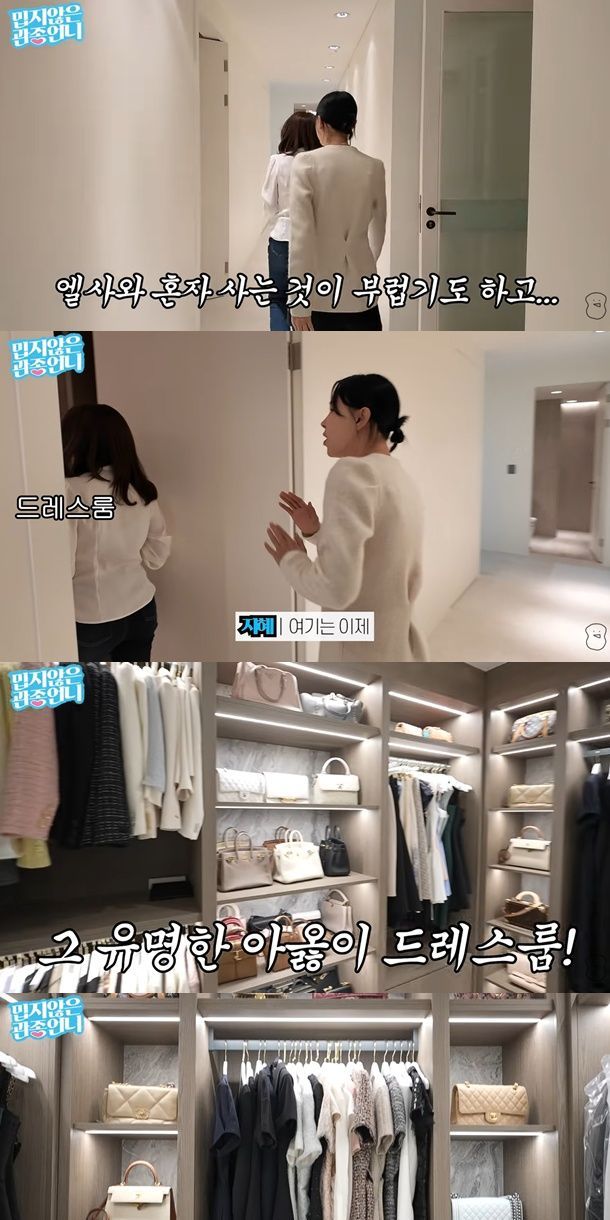이어 공개된 드레스룸에는 명품 의류와 가방들이 가지런히 정리돼 있었다. 이를 둘러본 이지혜는 "옷도 너무 예쁘다. 샤넬을 좋아하는구나"라며 아옳이의 취향을 단번에 짚었고, "내가 보니까 품위와 품격이 있다"고 감탄을 보탰다.
