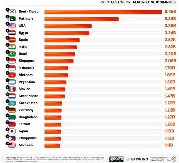 뉴시스 보도에 따르면, AI 영상 편집 플랫폼 카프윙(Kapwing)이 지난해 11월 국가별 인기 유튜브 채널 상위 100개를 분석해, AI 슬롭 콘텐츠를 게시하는 채널의 조회 수와 구독자 수를 집계한 결과, 한국 기반 AI 슬롭 채널의 누적 조회 수가 84억5000만 회로, 조사 대상 국가 중 가장 많았다.