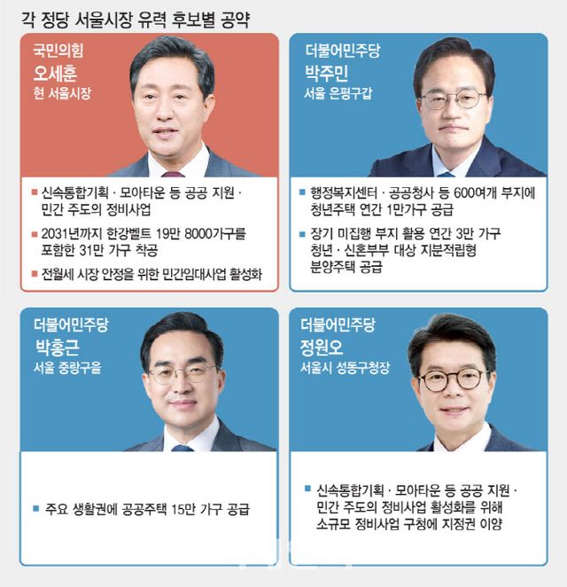 현역인 오 시장은 2021년 당선 이후 꾸준히 추진해 온 신속통합기획·모아타운 등 공공 지원·민간 주도의 정비사업을 내세울 가능성이 크다. 오 시장은 지난해 7월부터 정비사업지를 돌며 이재명 정부의 부동산 정책을 강력히 비판했다. 지난해 9월 말에는 공공 주도의 9·7 부동산 대책과 차별점을 둔 ‘신속통합기획 2.0’을 발표했다. 정비사업 활성화를 통해 2031년까지 한강벨트 19만 8000가구를 포함해 총 31만 가구를 착공하겠다는 계획이다.
