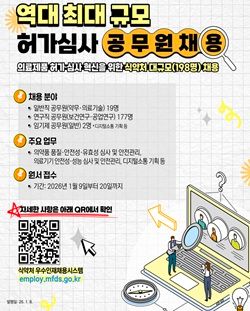 식품의약품안전처(처장 오유경)가 신약, 바이오시밀러, 의료기기 등의 허가·심사 등을 담당하는 일반직(약무·의료기술), 연구직(보건·공업), 임기제(일반) 공무원을 1월 20일까지 공개 채용한다.