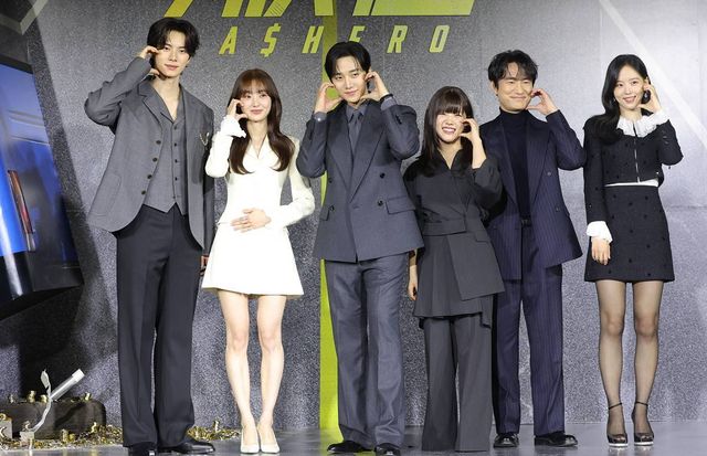 배우 이채민(왼쪽부터)과 김혜준, 이준호, 김향기, 김병철, 강한나가 지난해 12월 22일 서울 강남구 웨스틴 서울 파르나스에서 열린 넷플릭스 시리즈 '캐셔로' 제작발표회에 참석해 포즈를 취하고 있다. '캐셔로'는 결혼자금, 집값에 허덕이는 월급쟁이 '상웅'이 손에 쥔 돈만큼 힘이 강해지는 능력을 얻게 되며, 생활비와 초능력 사이에서 흔들리는 생활밀착형 내돈내힘 히어로물이다 / 뉴스1