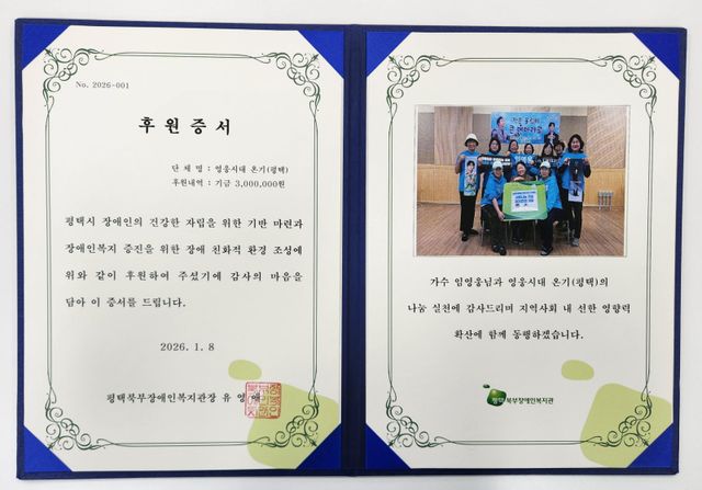 가수 임영웅 팬클럽 ‘영웅시대 온기(평택)’가 1월 8일 평택시 장애인복지관을 찾아 기부금 300만원을 전달했다. 이번 기부는 새해를 맞아 지역 내 장애인 복지 증진에 보탬이 되고자 회원들의 자발적인 뜻을 모아 마련됐다.