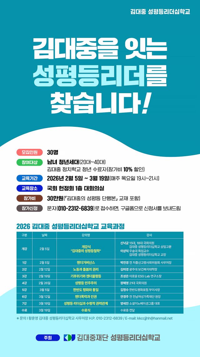 <김대중재단>이 오는 2월 5일 ‘김대중 성평등리더십학교’를 개설한다. 재단은 "이번 과정은 20~40대 남녀 청년세대를 대상으로, 성별과 입장의 차이를 넘어 민주주의와 성평등, 리더십이라는 공동의 질문을 함께 나누고 연결하는 장을 만드는 데 목적이 있다"고 밝혔다.