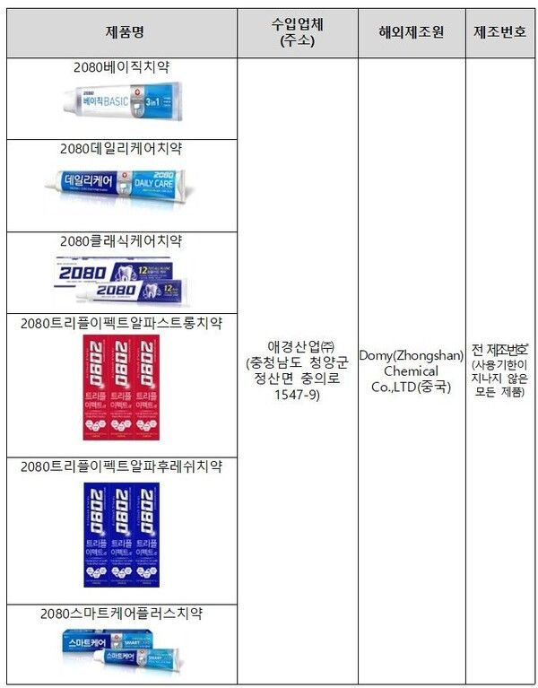 회수 대상 제품은 ▲2080베이직치약 ▲2080클래식케어치약 ▲2080데일리케어치약 ▲2080트리플이펙트알파후레쉬치약 ▲2080스마트케어플러스치약 ▲2080트리플이펙트알파스트롱치약 등이다.