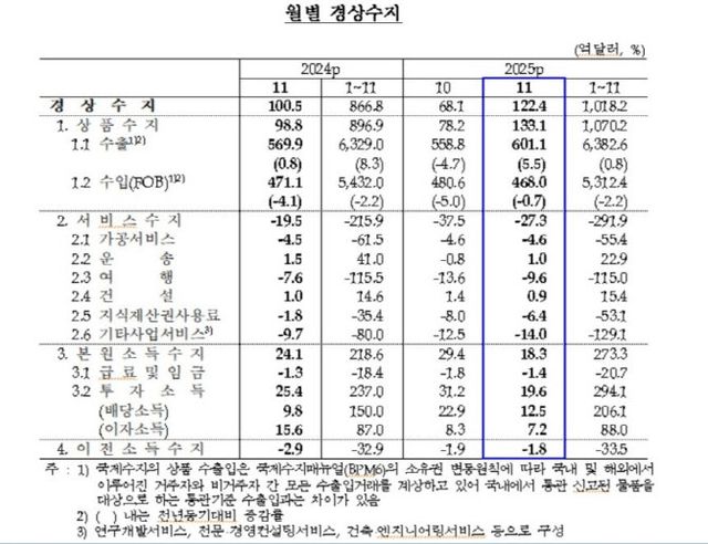 9일 한국은행이 발표한 ‘11월 국제수지(잠정)’에 따르면 올해 11월 경상수지는 122억 4000만달러 흑자로 집계됐다. 전월(68억 1000만달러)에 비해 두 배 가량 흑자 폭이 확대됐다. 경상수지는 11월 기준 역대 최대이자, 2023년 5월 이후 31개월째 흑자 행진을 이어갔다.