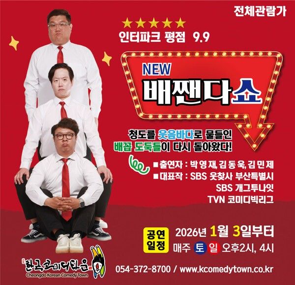 [투어코리아=남동락 기자]청도군(군수 김하수)은 한국코미디타운의 브랜드 공연 ‘NEW 배짼다쇼’가 더욱 완벽해진 모습으로 돌아왔다고 9일 밝혔다.