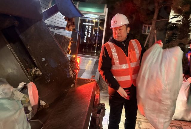 | ▲ 김종훈 동구청장은 9일 오전 6시 30분 방어동 일원에서 생활폐기물 수거업체 노동자와 함께 작업 현장에서 폐기물 수거 체험을 하고 있다. |