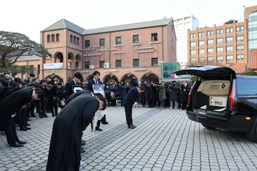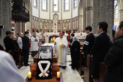영결식 마지막에는 헌화가 진행됐다. 배우 현빈, 주지훈, 예지원, 오지호, 가수 바다를 비롯해 임권택·민규동·이준익 감독과 정순택 천주교 서울대교구장 대주교 등이 고인의 마지막 길을 함께했다.