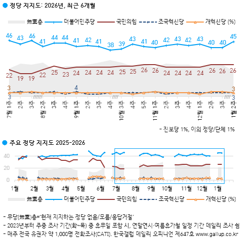 한국갤럽이 지난 6~8일 전국 만 18세 이상 남녀 1000명을 대상으로 정당 지지율 조사를 실시한 결과(95% 신뢰수준에 ±3.1% 포인트) 민주당 45%, 국민의힘 26%, 조국혁신당 3%,개혁신당 3%, 진보당 1% 등으로 나타났다.