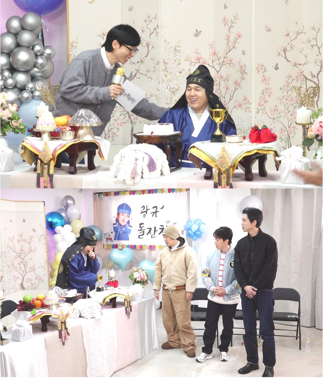 김광규는 꼬까한복으로 갈아입고 케이크, 과일, 떡 등 풍성하게 차려진 돌상 앞에 앉는다. 하하, 허경환, 주우재는 장난감을 흔들며 돌사진 촬영을 돕고 “우리 뀨, 이가 다 났어요!”라며 우쭈쭈 분위기를 만든다. 김광규는 귀염뽀짝 포즈를 취하다가도 현타를 맞고 “이 상을 언제 엎을까 생각 중이다”라고 말한다. 이어 박력 있는 케이크 커팅식으로 현장을 웃음바다로 만든다.