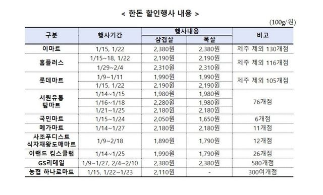 이마트와 홈플러스, 롯데마트, GS리테일, 농협 하나로마트를 비롯해 탑마트, 메가마트, 킴스클럽, 식자재왕도매마트 등 주요 유통업체들이 참여한다. 행사 기간과 판매 가격은 유통사별로 다르지만, 대부분 100g당 1900원대에서 2300원대 수준으로 삼겹살과 목살을 판매할 계획이다. 일부 매장은 특정 기간에만 행사를 진행하며, 제주 지역은 제외되는 곳도 있다.