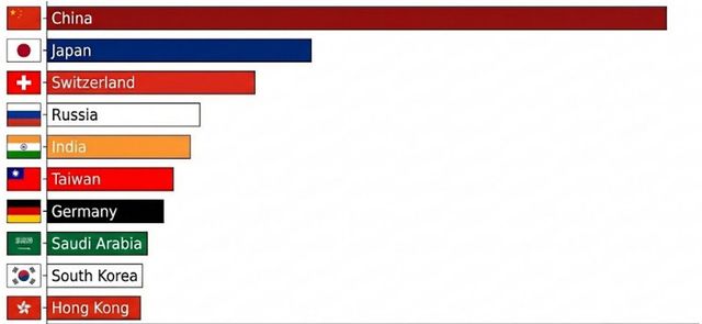 이어 러시아가 7346억 달러로 4위, 인도가 6879억 달러로 5위를 기록했다. 인도의 경우 상위권 국가 중 전월 대비 18억 달러 감소세를 보였다. 대만(5998억 달러), 독일(5523억 달러), 사우디아라비아(4637억 달러)가 그 뒤를 이으며 6위에서 8위권을 형성했다. 우리나라는 9위를 기록했으며, 10위 홍콩(4294억 달러)과는 근소한 차이를 보이고 있다.