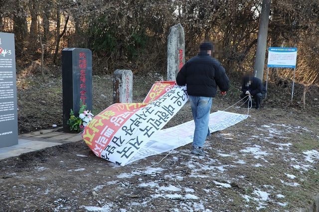 또 이 현수막은 4·3 당시 제주도민에 대한 무차별적 진압을 주도한 박진경 대령의 과거 행적을 기술한 '바로 세운 진실' 안내판(이하 안내판) 앞에 게시돼 지나가는 사람들은 안내판 내용을 보기 힘드는 등 시야를 가리고 있다는 지적을 받았다.