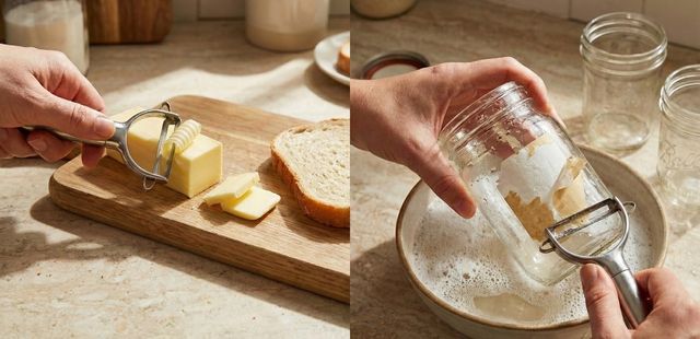 AI로 생성한 이미지. 감자칼을 이용하면 딱딱한 버터도 얇게 슬라이스할 수 있다. 유리병에 붙은 스티커도 빠르게 제거하는 데 도움 된다.