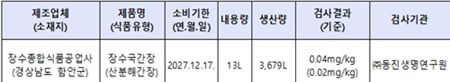식품의약품안전처(처장 오유경)는 식품제조·가공업체인 ‘장수종합식품공업사(경상남도 함안군 소재)’가 제조·판매한 ‘장수국간장(식품유형 : 산분해간장)’에서 3-MCPD가 초과 검출되어 해당 제품을 판매 중단하고 회수 조치한다고 밝혔다.