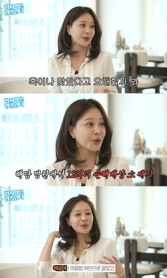 이어 “기흉도 생겼다. 그런데 처음에는 소송하지 않고 넘어가려 했다. 멍 투성이라 사람들이 맞았다고 오해할까 봐 병원 이름을 밝히지 않은 채 ‘이런 일이 있었다’고만 이야기했다”며 “그런데 병원 측에서 오히려 저에게 12억 원을 물어내라는 소송을 걸었다”고 말했다.
