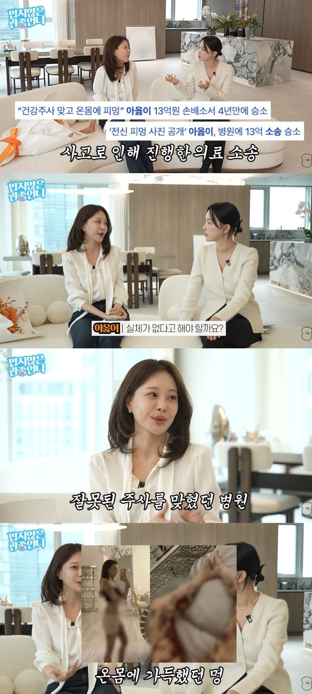 (엑스포츠뉴스 오승현 기자) 아옳이가 병원에서 시술을 받고 온몸에 피멍이 들었던 의료 사고 사건을 언급했다.