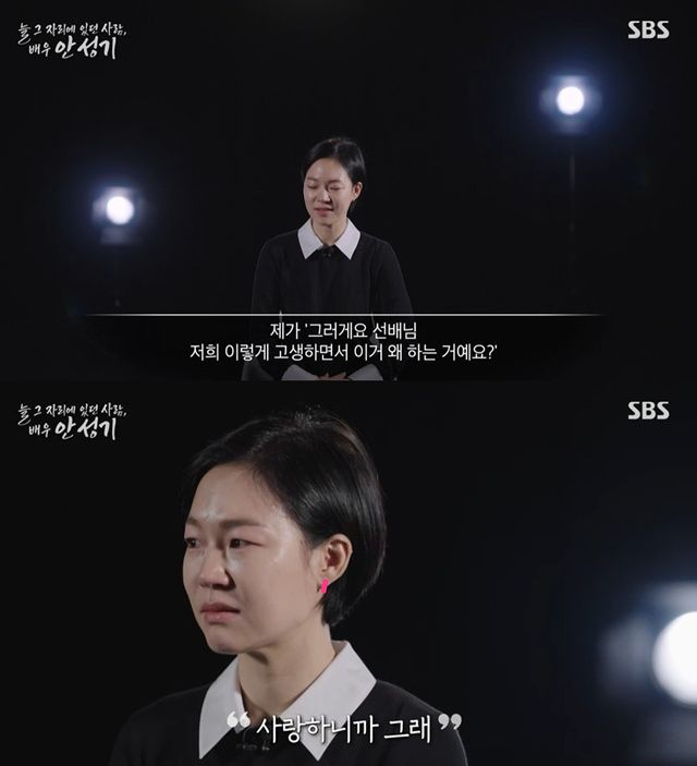 한예리는 "(안성기가) 이렇게 춥고 힘들고 배고픈데 우리가 이 일을 왜 이렇게 하는 걸까 질문을 하셨다. 제가 '그러게요, 이렇게 고생하며 왜 하는 거냐' 반문했다. 선배가 '사랑하니까 그래'라고 답했다"며 눈물을 흘려 고인의 영화 사랑을 전했다.