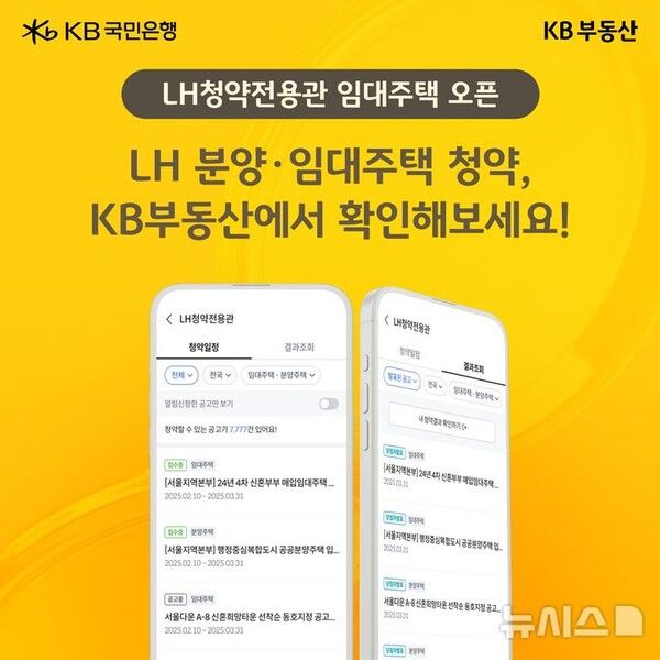 뉴시스 보도에 따르면, LH청약전용관은 지난해 12월 KB국민은행과 한국토지주택공사(LH) 간 업무협약(MOU)을 기반으로 민간 플랫폼 최초로 LH 분양주택 청약 정보를 제공하는 서비스다. 기존 분양주택에 이어 LH 분양·임대주택 청약 정보를 한 곳에서 간편하게 확인할 수 있게 됐다.