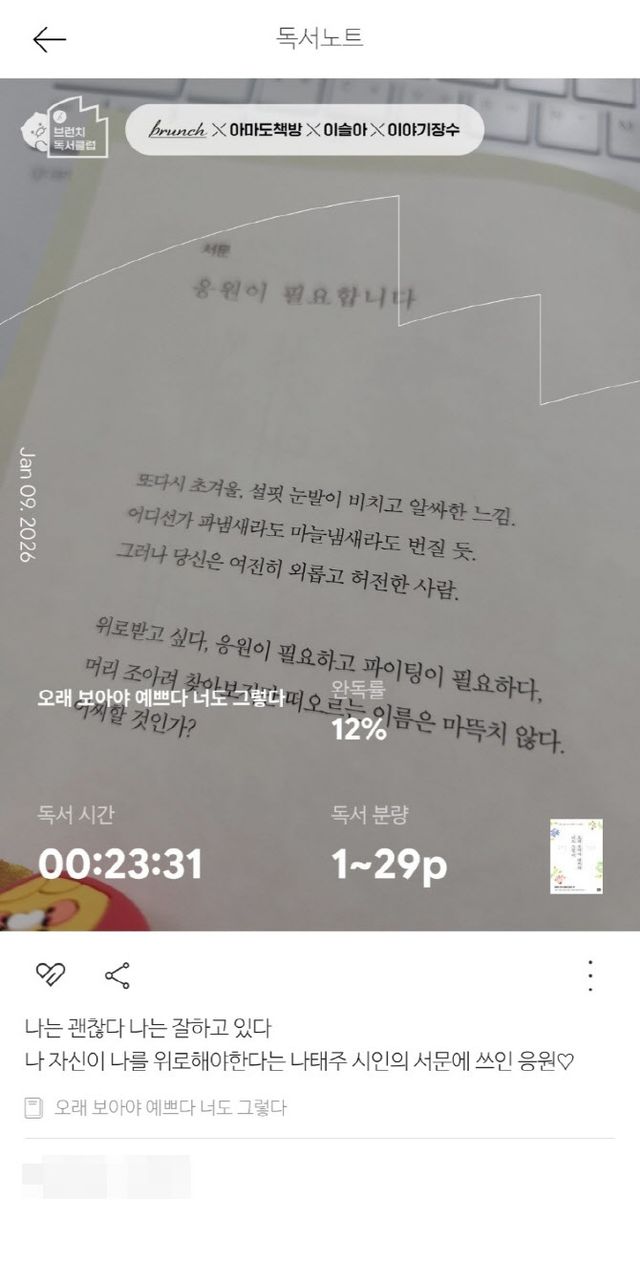이번엔 장르를 바꿔 나태주 시인의 ‘오래 보아야 예쁘다 너도 그렇다’ 시집으로 골랐다. 시집 서문 ‘응원이 필요합니다’부터 기운이 났다. 이렇게 인상 깊게 남은 책 페이지를 사진으로 찍어 필터를 입혀보니 그럴싸한 독서 노트가 완성됐다. 오늘 책 한쪽이라도 읽었다는 뿌듯함이 밀려왔다.