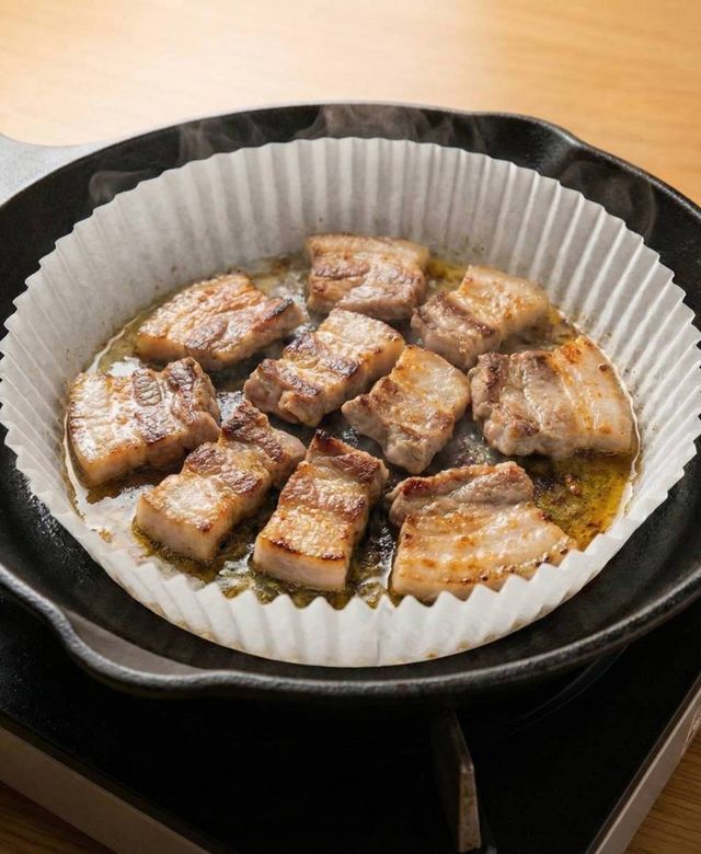 이 방법의 핵심은 프라이팬에 고기를 바로 올리지 않는 것이다. 팬 위에 에어프라이어용 종이호일을 먼저 깔고, 그 위에 삼겹살을 올려 굽는다. 호일이 고기에서 나오는 기름을 흡수하거나 한쪽으로 모아주면서, 팬 밖으로 튀는 양을 눈에 띄게 줄여준다. 별도의 튀김 방지망이나 복잡한 조리도구 없이도 효과를 볼 수 있다는 점이 강점이다.