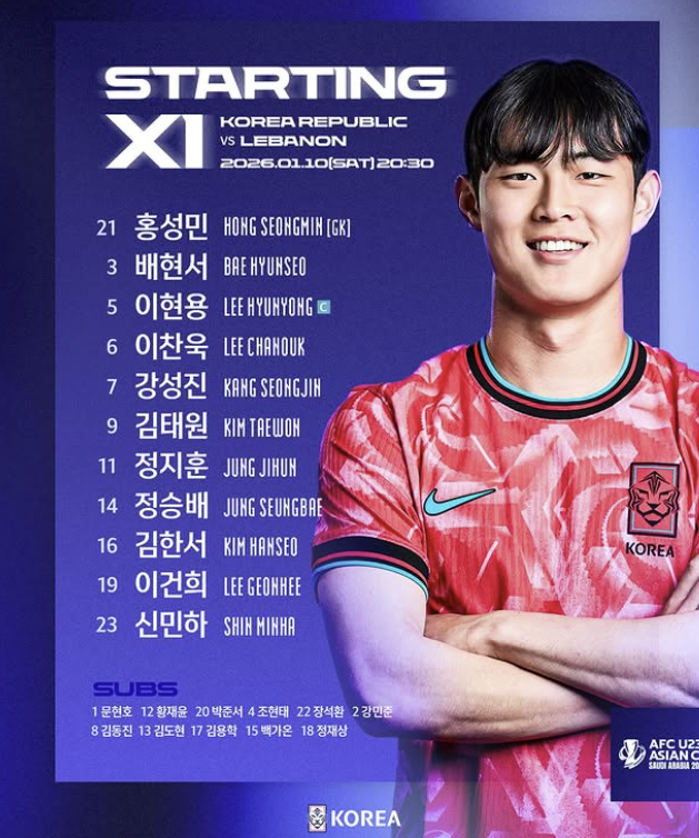 이민성 감독이 이끄는 대한민국 23세 이하(U-23) 축구대표팀은 10일 오후 8시30분(한국시간)부터 사우디아라비아 리야드 알 샤밥 클럽 경기장에서 2026 아시아축구연맹(AFC) U-23 아시안컵 조별리그 C조 2차전을 치르고 있다.