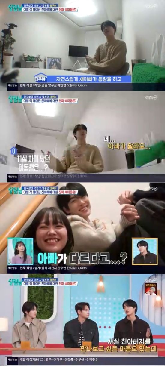 타쿠야는 "초등학교 3학년때 아빠가 없어지고 새 아빠가 등장을 했다. 11살 차이가 나는 막내 여동생은 아빠가 다르다"고 가정사를 공개했다.