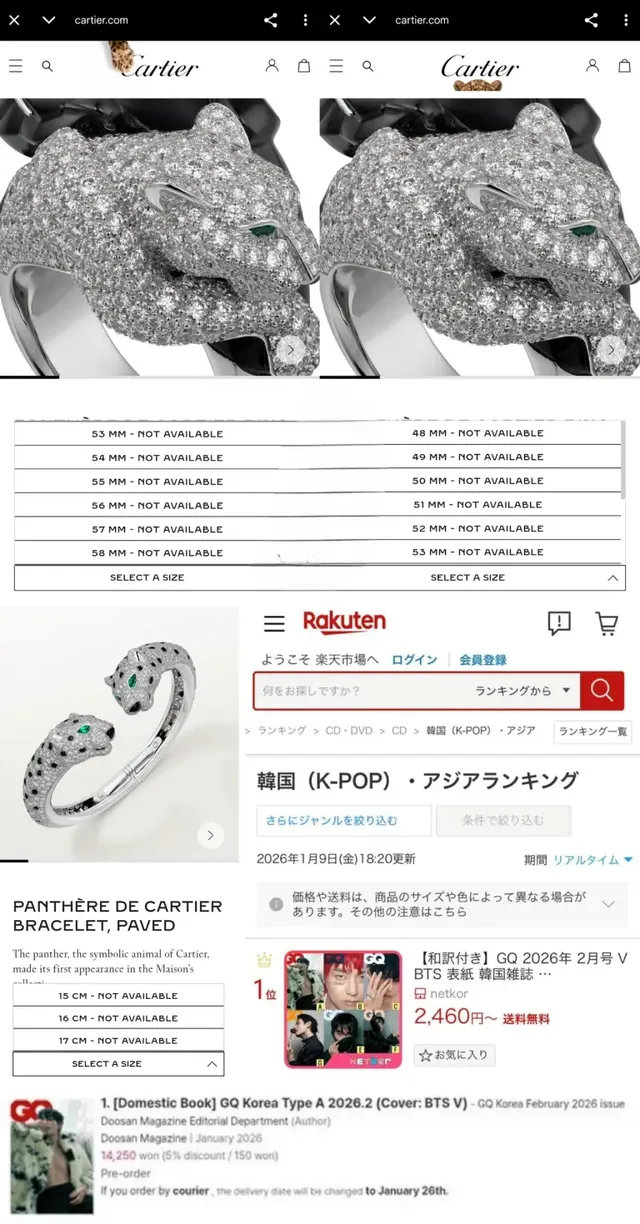 뷔가 이번 화보에서 착용한 까르띠에 제품들은 ‘뷔 이펙트’를 여실히 보여주며 패션 시장에 강력한 파급력을 선사한다. 특히 4만 9800달러(한화 약 7300만 원)에 달하는 ‘LOVE 다이아몬드 파베 브레이슬릿’은 미국, 영국, UAE 등 여러 국가 공식 웹사이트에서 일찌감치 품절되며 놀라움을 안겼다. 더불어 까르띠에의 상징적인 ‘팬더 링’ 또한 모든 사이즈가 품절돼 그의 글로벌 영향력을 재확인시켰다. 뷔는 앞서 2023년 7월 까르띠에 글로벌 앰버서더 발탁 소식만으로 브랜드 웹사이트를 마비시키고 고가 목걸이까지 품절시킨 바 있어, 이번 화보 역시 그의 강력한 브랜드 파워를 입증하는 계기가 됐다.