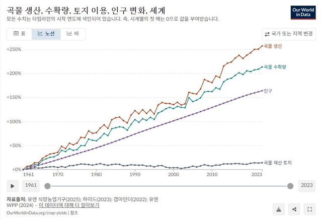 데이터 전문 매체인 Our World in Data(OWiD)에 따르면, 전 세계 곡물 생산량은 1961년 대비 250%라는 경이로운 수치로 증가했다.
