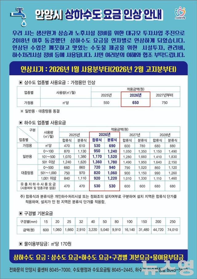 (뉴스영 이현정 기자) 안양시는 1월 사용분(2월 고지분)부터 상하수도 요금을 인상한다고 11일 밝혔다.
