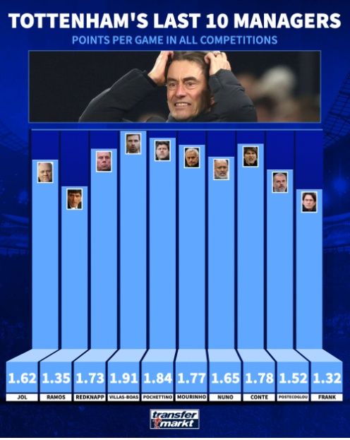 프랑크 감독의 평균 승점은 2007~2008시즌 단명했던 후안데 라모스 감독이 기록한 1.35점보다도 낮다. ‘황금기’로 평가받는 마우리시오 포체티노 감독 시절의 1.84와는 큰 격차를 보인다. 주제 무리뉴(1.77), 안토니오 콘테(1.78) 등 선수비 후역습의 실용적 전술을 선보였던 시기와도 비교가 되지 않는다. 심지어 2021년 경질됐던 누누 산투(1.65)보다도 뒤처진 성적이다.