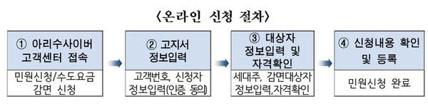 방문 신청 또는 온라인 신청이 가능하다. 방문 신청은 오는 12일부터 감면 받을 주소지 관할 동주민센터에서 접수한다. 온라인 신청은 오는 3월 3일부터 서울아리수본부 누리집 내 아리수 사이버고객센터에서 할 수 있다.