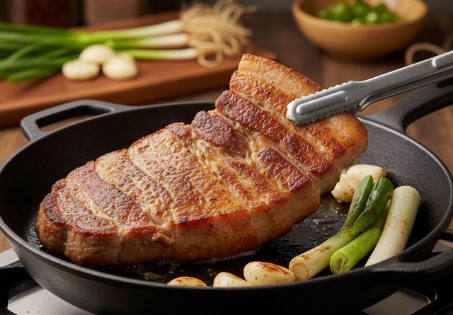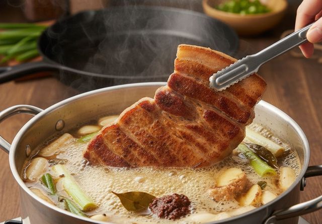 끓는 물에 구운 삼겹살을 넣는 모습 (기사 이해를 돕기 위해 AI로 제작됨)