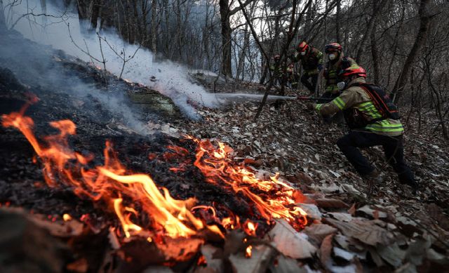 산림 당국은 전날 오후 3시 40분께 ‘대응 2단계’를 발령하고 인력 800여명과 헬기 15대, 진화 장비 120여대 등을 투입해 진화 작업을 시작했다.