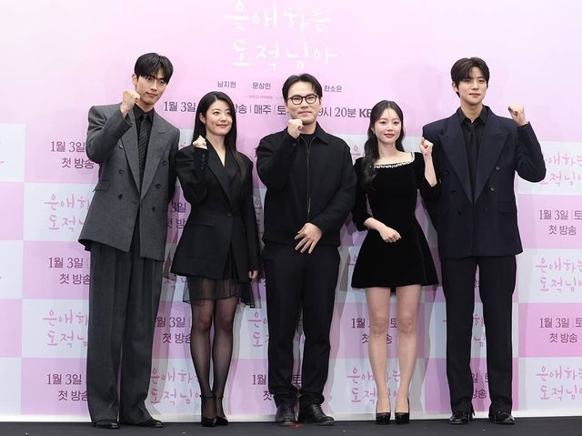배우 홍민기(왼쪽부터)와 남지현, 함영걸 PD, 한소은, 문상민이 지난해 12월 30일 서울 마포구 스탠포드호텔에서 열린 KBS 2TV 새 토일 미니시리즈 ‘은애하는 도적님아 제작발표회에 참석해 포즈를 취하고 있다. ’은애하는 도적님아‘는 어쩌다 천하제일 도적이 된 여인과 그녀를 쫓던 대군, 두 남녀의 영혼이 바뀌면서 서로를 구원하고 종국엔 백성을 지켜내는 위험하고 위대한 로맨스를 담은 작품이다 / 뉴스1