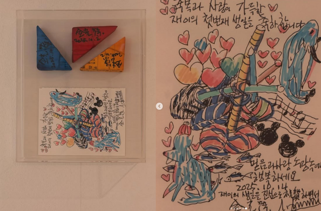 또다른 사진엔 전광영 작가가 재이를 위해 그린 그림과 편지가 담겼다. 전광영 작가는 “축복과 사랑이 가득한 재이의 첫 번째 생일을 축하합니다. 믿음과 사랑 소망 속에 행복하세요. 2025. 10. 14 재이의 생일을 진심으로 축하하면서”라고 가족을 축복했다.