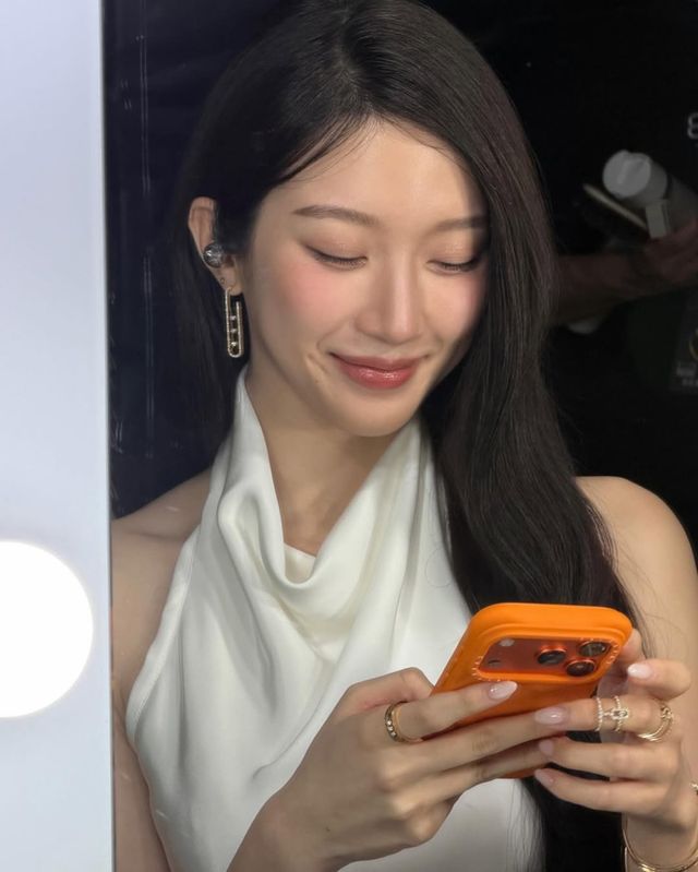 또 다른 사진에서는 대기실에서 휴대전화를 바라보며 옅은 미소를 짓고 있는 모습이 포착됐다. 은은한 메이크업과 차분한 표정이 어우러지며 문가영 특유의 우아하고 단아한 매력을 더욱 돋보이게 했다.