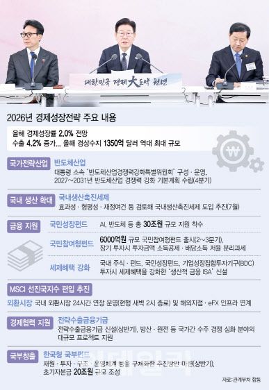 올해 경제성장률 2.0% 전망의 원천인 반도체는 정부가 그리는 잠재성장률 반등 시나리오의 가장 중심에 자리를 잡았다. 정부는 ‘세계 2강’ 도약을 위해 반도체를 국가전략산업으로 육성하고 금융·재정·세제·규제 완화 등 전방위적 지원을 쏟겠단 방침이다. 올해 안에 대통령 소속 ‘반도체산업경쟁력강화특별위원회’를 띄우고 2027~2031년에 실행할 반도체산업경쟁력강화 기본계획도 수립한다.