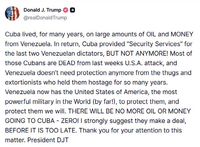 이어 “그 대가로 쿠바는 베네수엘라의 마지막 두 독재자에게 ‘보안 서비스’를 제공했지만, 더이상 그렇지 않다”며 “그 쿠바인들은 대부분 지난주 미국의 공격으로 인해 사망했다”고 했다.