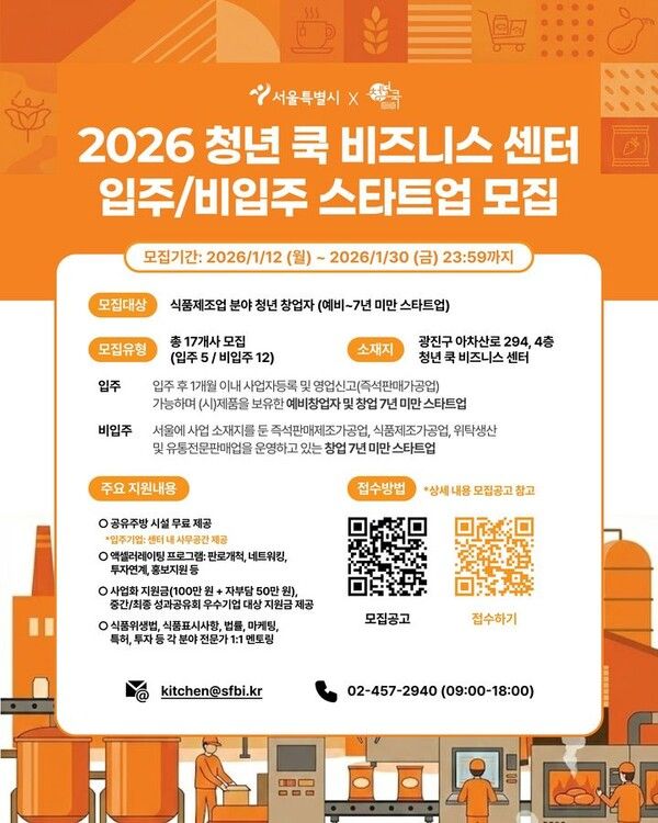 이번 모집은 식품 제조 인프라 지원에 특화된 '청년 쿡 비즈니스 센터'와 첨단 기술을 결합한 푸드테크 기업을 지원하는 '청년 쿡 푸드테크 센터' 두 곳에서 동시에 진행된다.