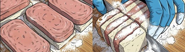 [만화] 스팸과 두부에 각각 전분을 뿌리고 겹쳐준 뒤 세트로 만들어 자른다.