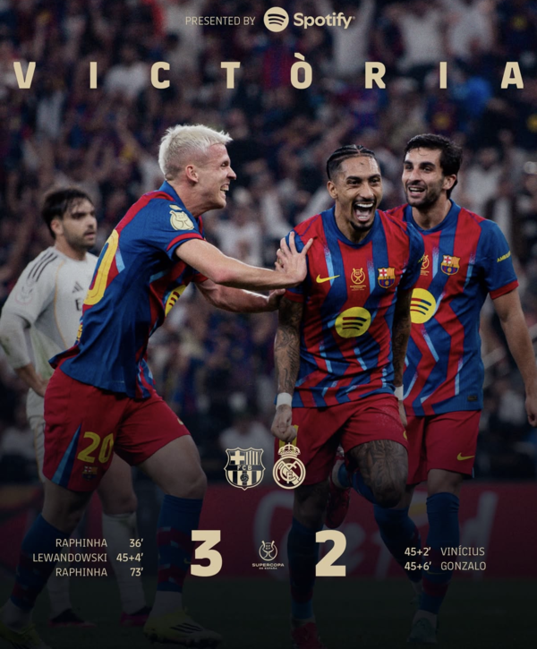 12일(한국시간) 사우디아라비아 제다의 킹 압둘라 스포츠 시티 스타디움에서 2026 수페르코파 데 에스파냐(스페인 슈퍼컵) 결승전을 치른 바르셀로나가 레알마드리드를 3-2로 꺾으며 우승했다. 이로써 바르셀로나는 2년 연속 숙적을 제압하고 슈퍼컵을 들었다.