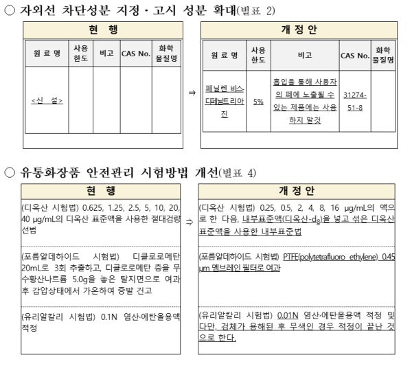 개정안에 따르면 화장품 업체가 신청한 페닐렌 비스-디페닐트리아진에 대한 심사 결과, 안전성 및 유효성 등 사용 타당성이 인정돼 해당 원료의 목록, 사용기준 등을 홈페이지에 공고한 바 있으며 이를 고시에 반영할 계획이다. 이로써 ‘자외선 차단’ 목적으로 사용 가능한 성분은 32개로 확대된다.