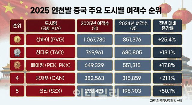 [이데일리 이민하 기자] 작년 인천공항에서 출발해 중국으로 향한 여행객 가운데 상하이가 제일 많았던 것으로 나타났다. 항공정보포털시스템에 따르면 2025년 인천공항 출발 상하이 푸동 공항 도착 여객은 106만명으로 전체 중국 도시 중 1위를 차지하며 전년 85만명 대비 25% 급증했다. 중국 무비자 시행 이후 처음 중국 여행을 계획한 한국 여행객 상당수가 상하이를 첫 목적지로 택한 것으로 풀이된다.