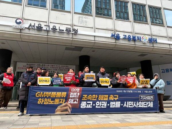 GM부품물류지회 공동대책위원회와 종교·법률·인권·시민사회단체는 12일 오전 서울 중구 서울고용노동청 앞에서 기자회견을 열고 "2026년 개정 노조법 시행을 앞두고 노조 할 권리가 무참히 짓밟힌 첫 사례"라며 이같이 밝혔다.