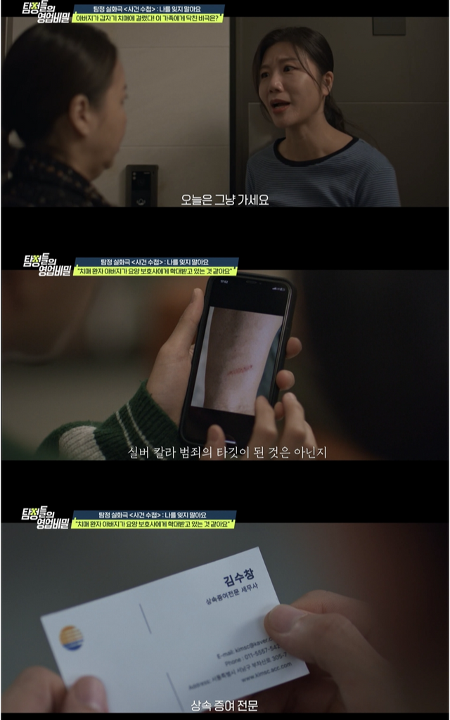 그러나 이후 의뢰인은 “아버지 몸에 알 수 없는 멍이 생기고, 최근 아버지 통장에서 현금이 인출되고 있다”며 요양 보호사의 소행을 의심했다고 한다. 탐정단은 요양 보호사가 의뢰인의 아버지를 데리고 외출하는 장면을 포착하고, 두 사람이 도착한 곳이 상속·증여 전문 세무사 사무실이라는 사실을 확인한다. 이후 탐문 과정에서 치매 환자 아버지를 둘러싼 수상한 정황과 가려져 있던 진실이 드러나며 스튜디오가 술렁인다.